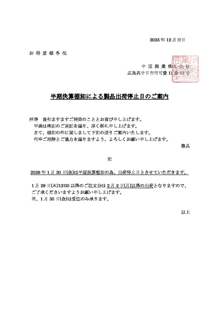 半期決算棚卸による1月30日 出荷停止のご案内